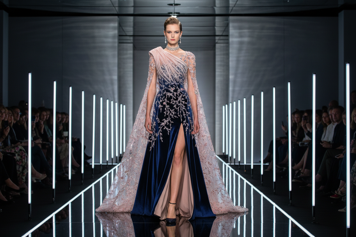 Bebe Mavisi Işıltılı Payet İşlemeli, Düşük Omuz Detaylı Balık Abiye