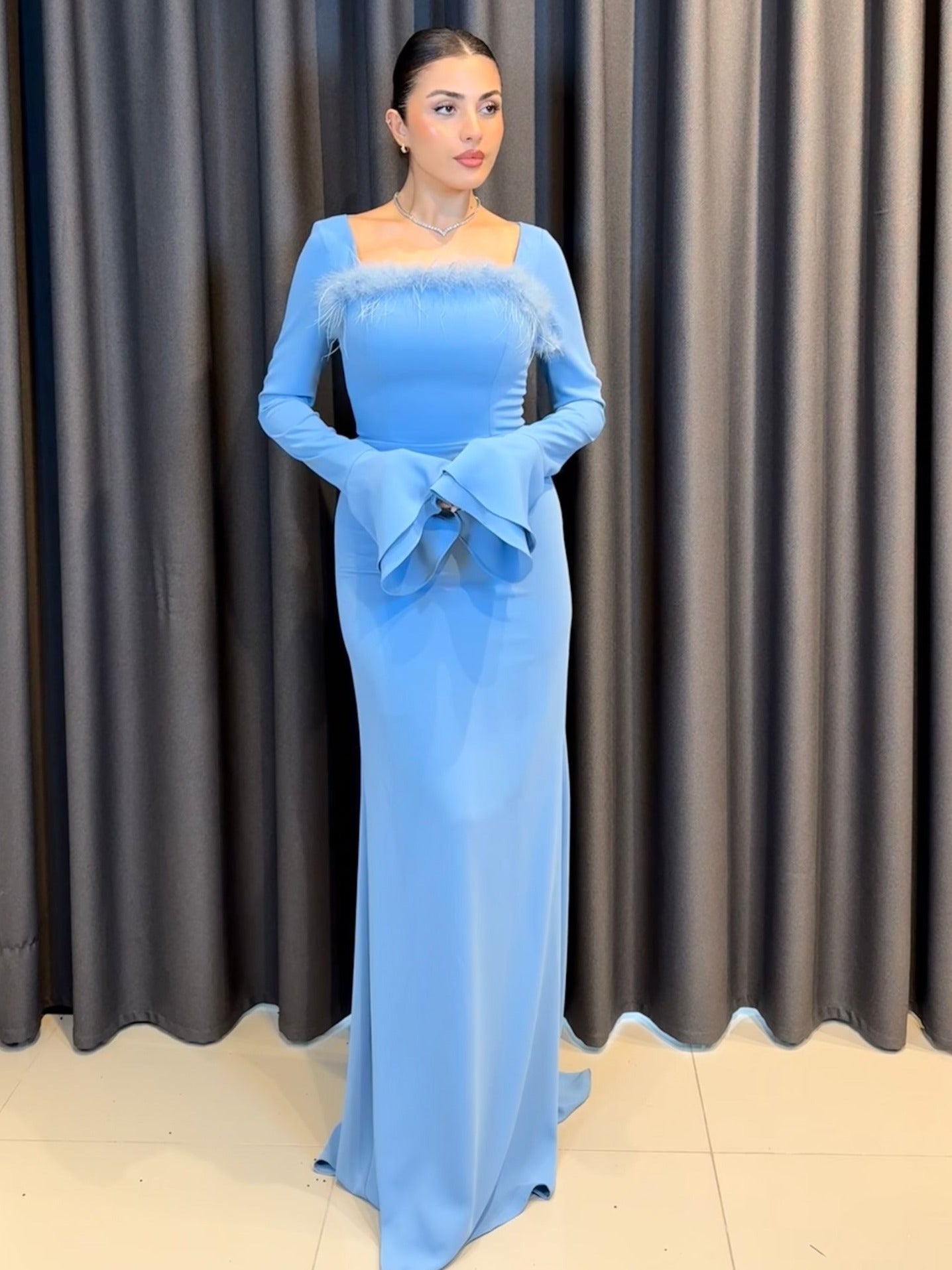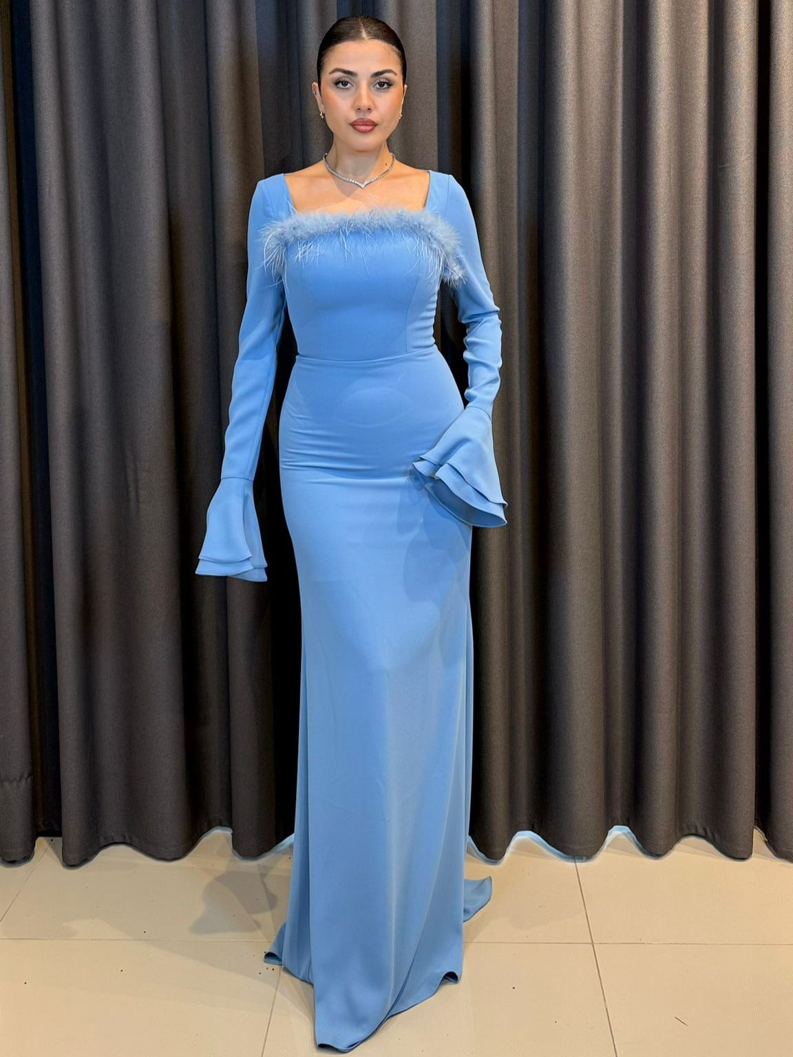 Bebek Mavisi Tüylü Kare Yaka Balık Abiye Elbise