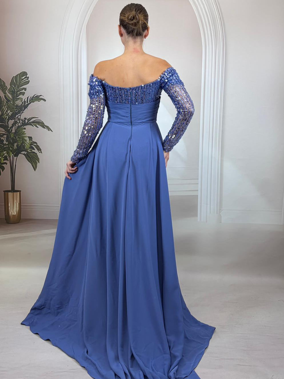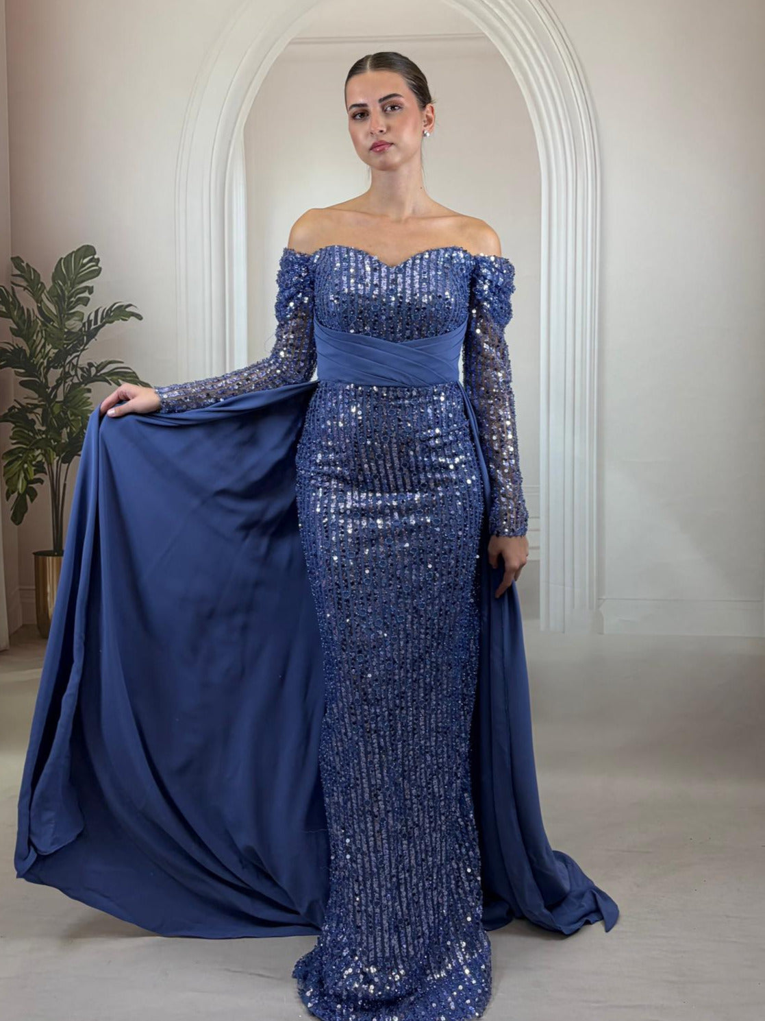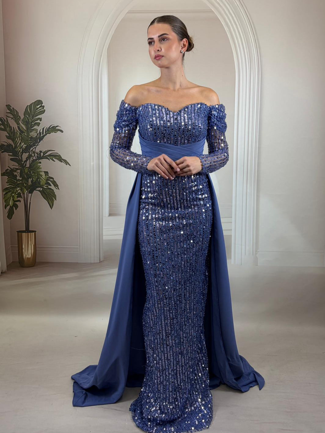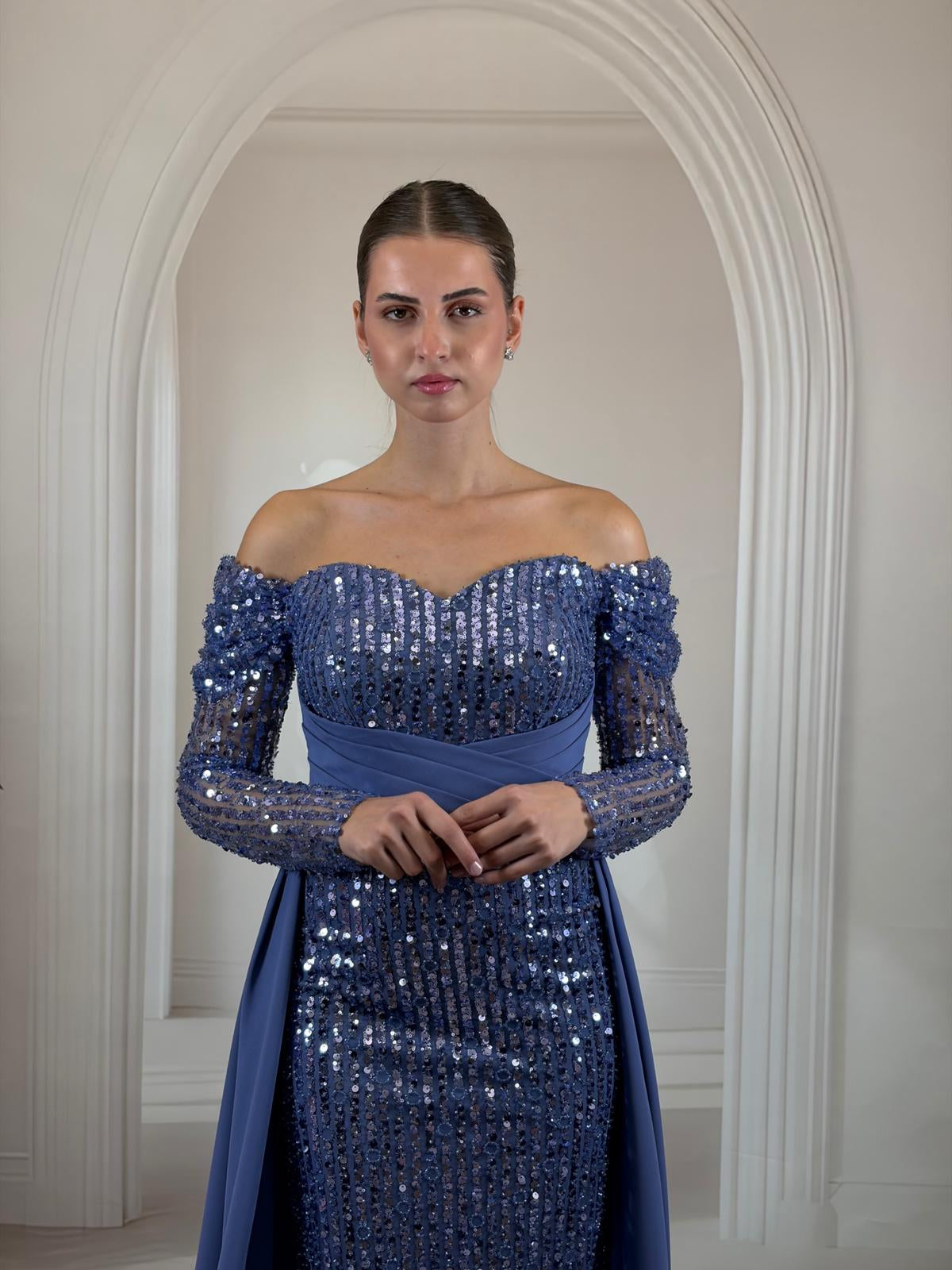 Yaka ve Kol: Köprücük kemiklerini ön plana çıkaran zarif düşük omuz (off-shoulder) kesim ve kolların tamamını saran payet işlemeli uzun kollar.