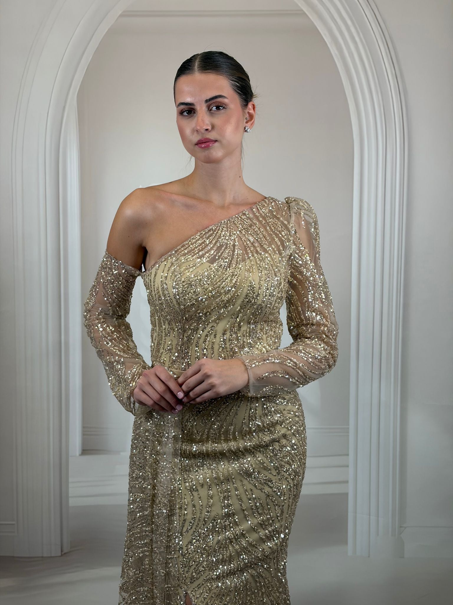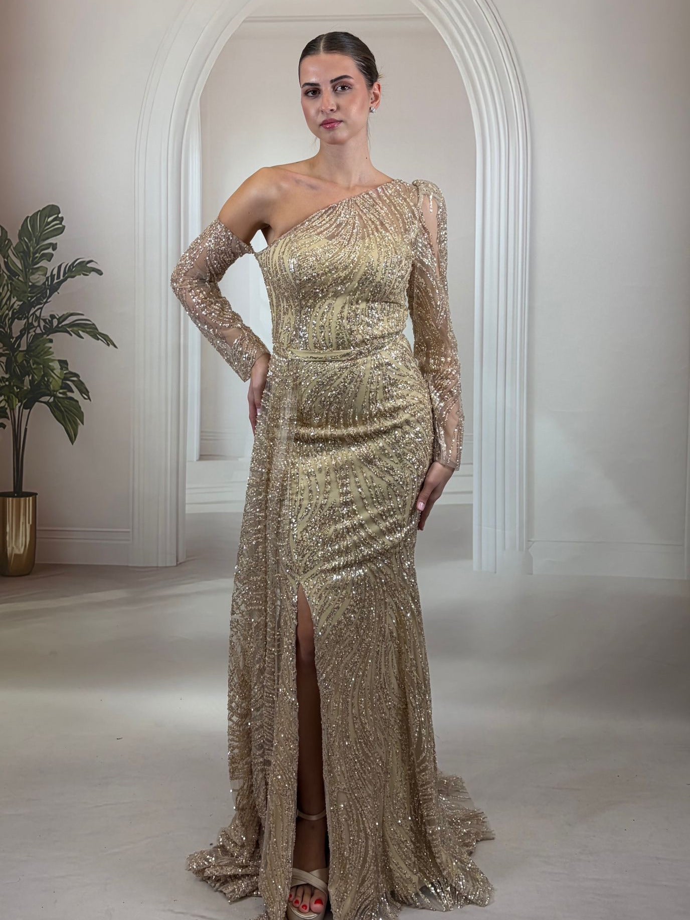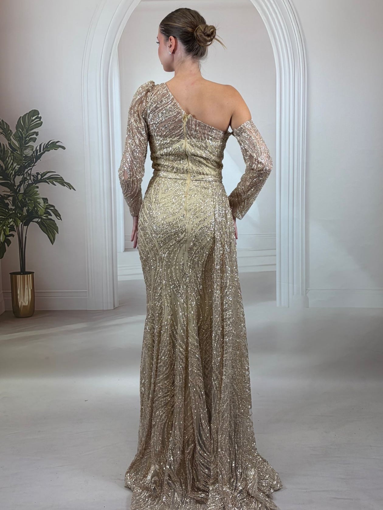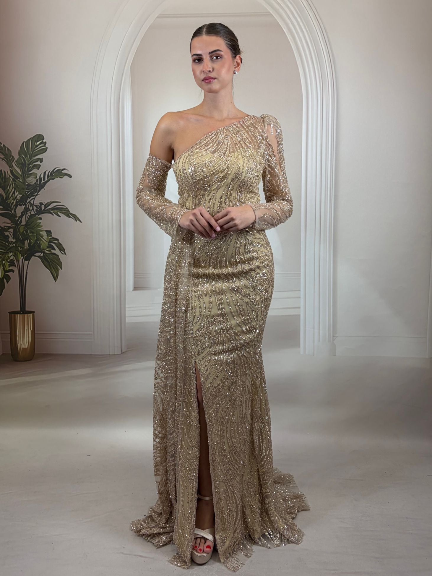 Işıltılı Altın Simli Gece Elbisesi - Özel Kesim Kollu ve Yırtmaçlı