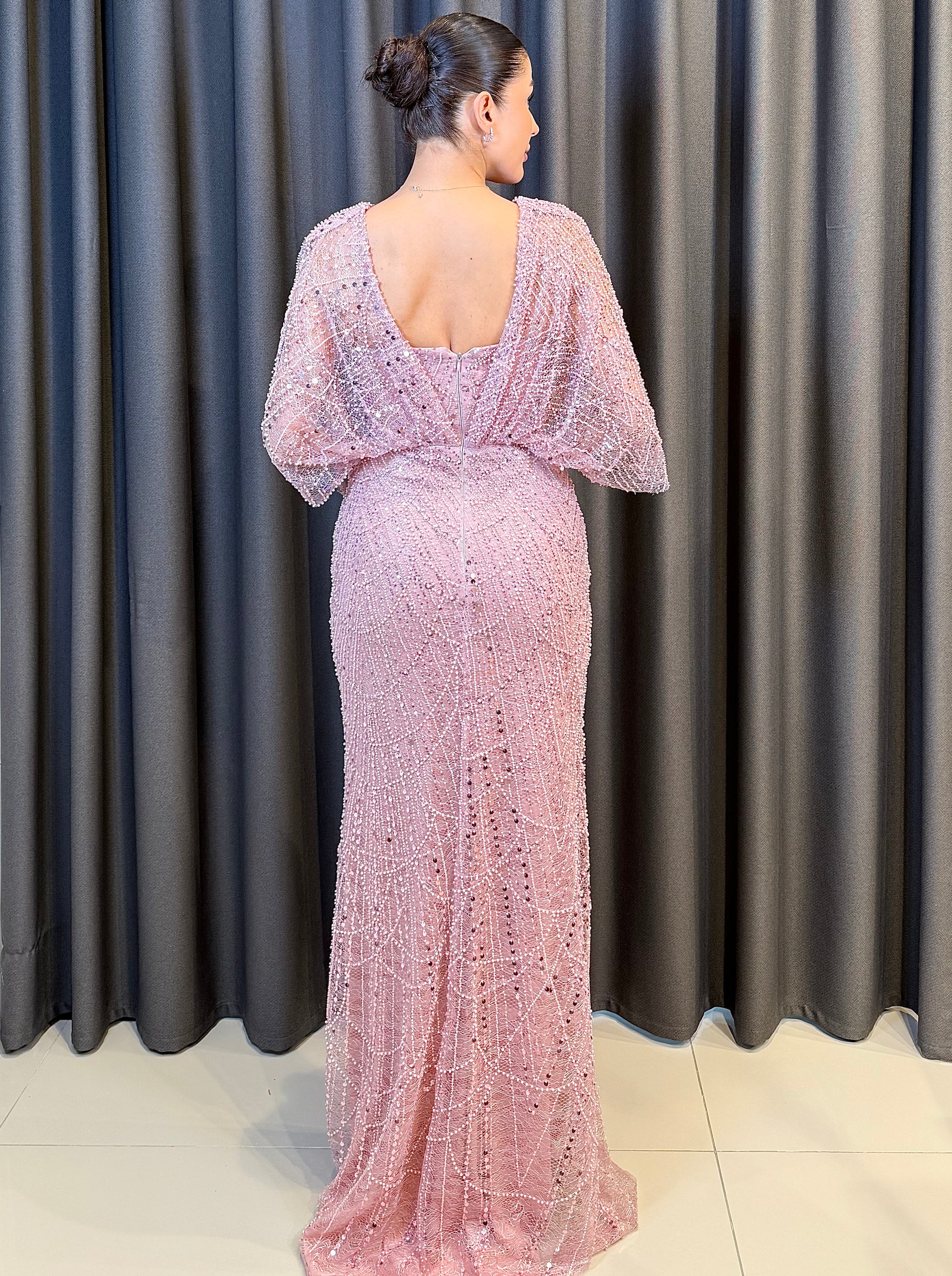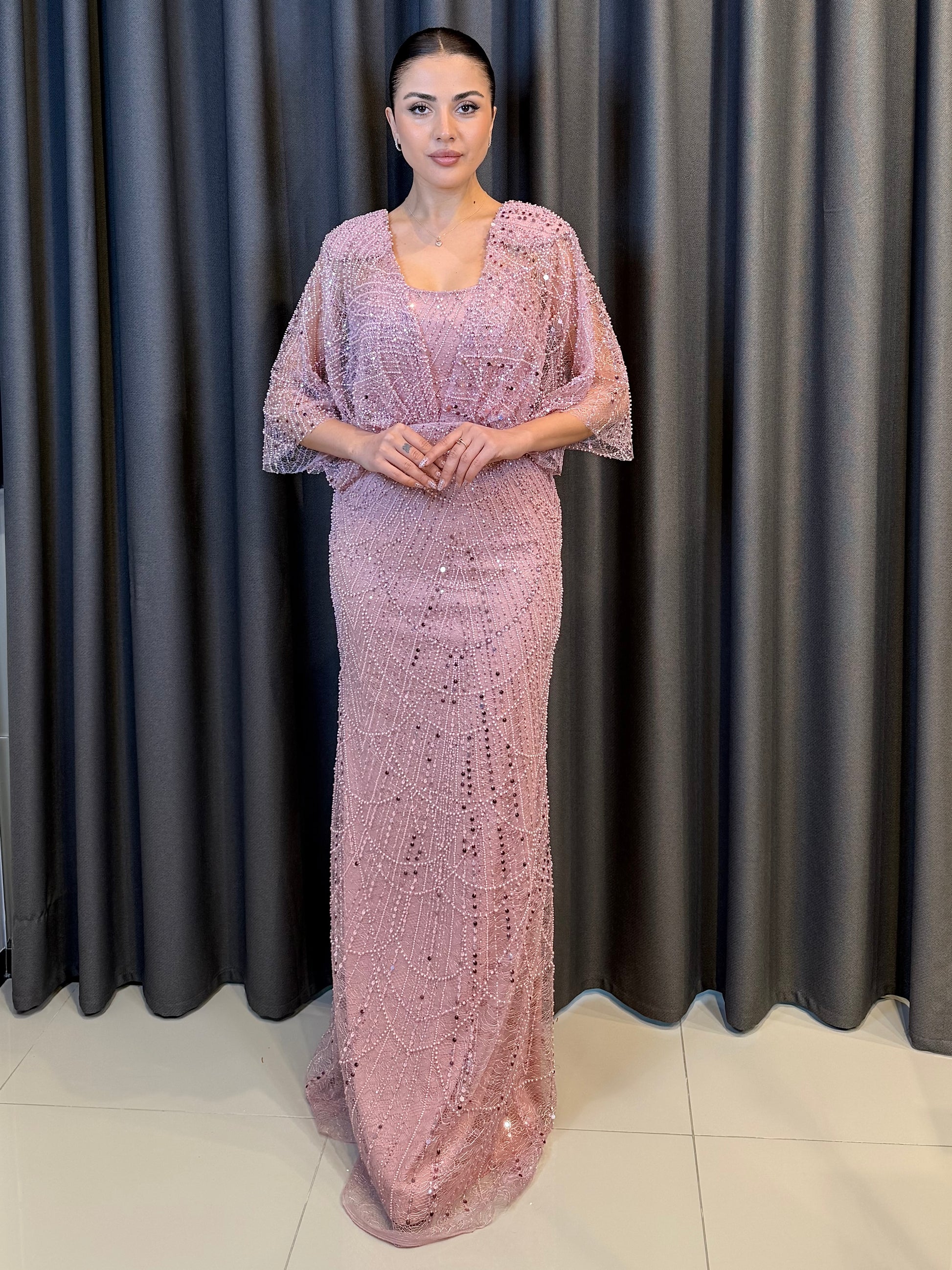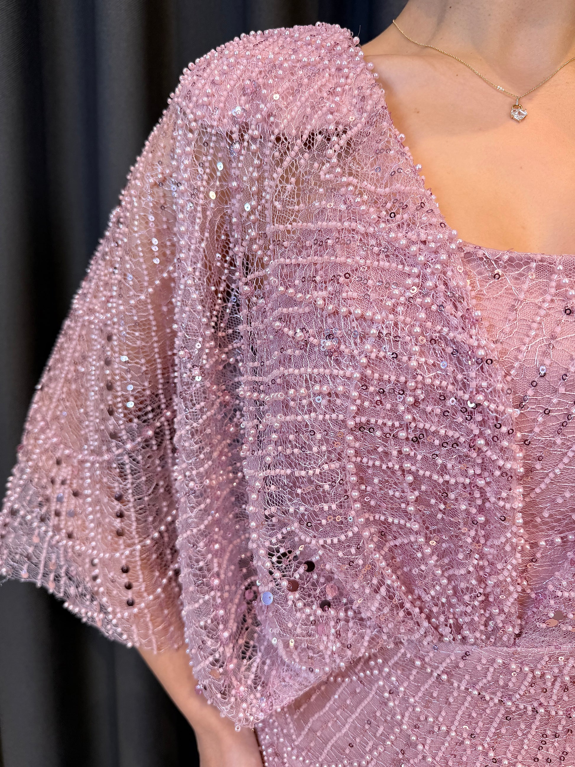Işıltılı Pudra Pembe Payet İşlemeli Pelerin Kollu Abiye