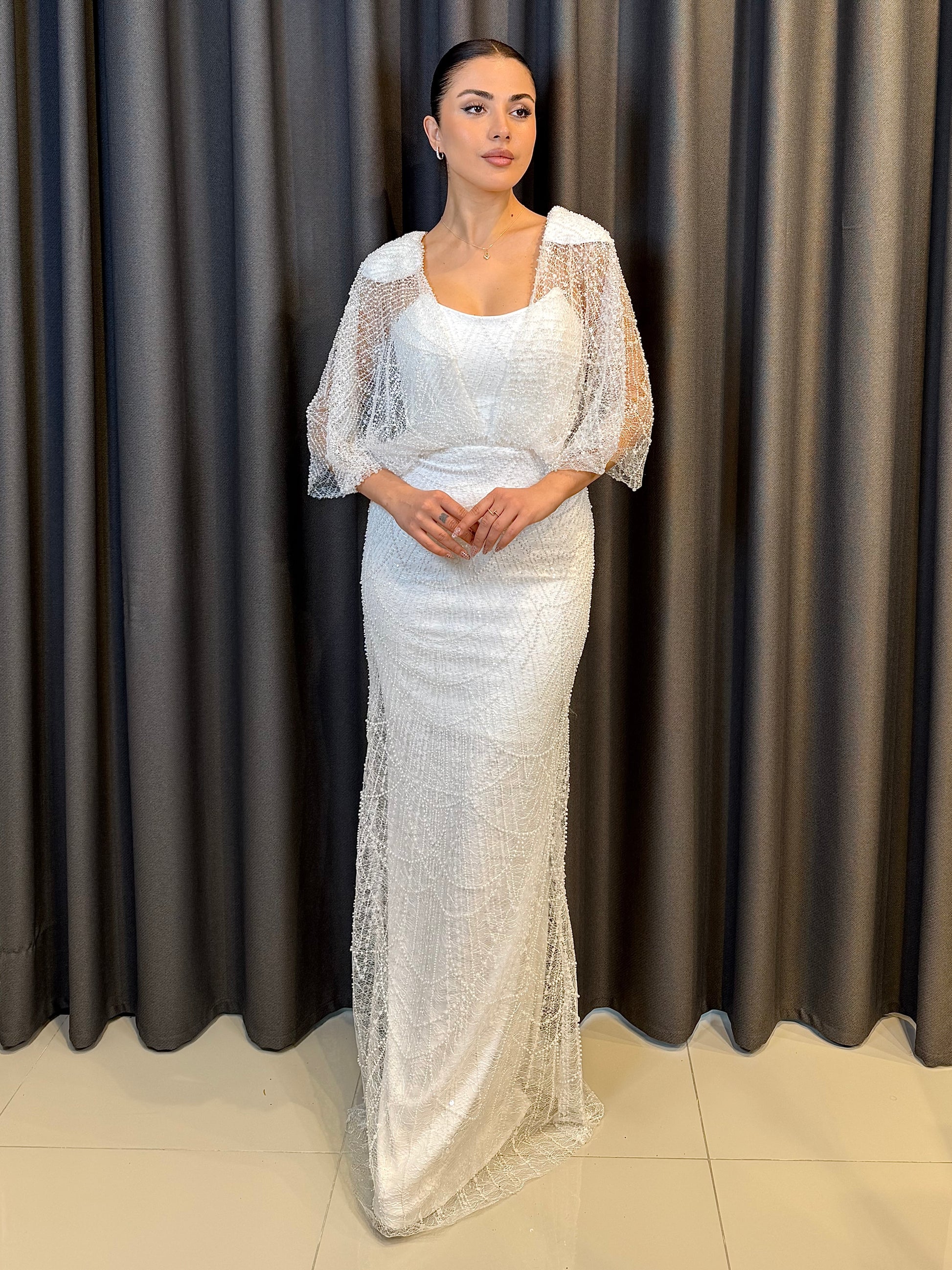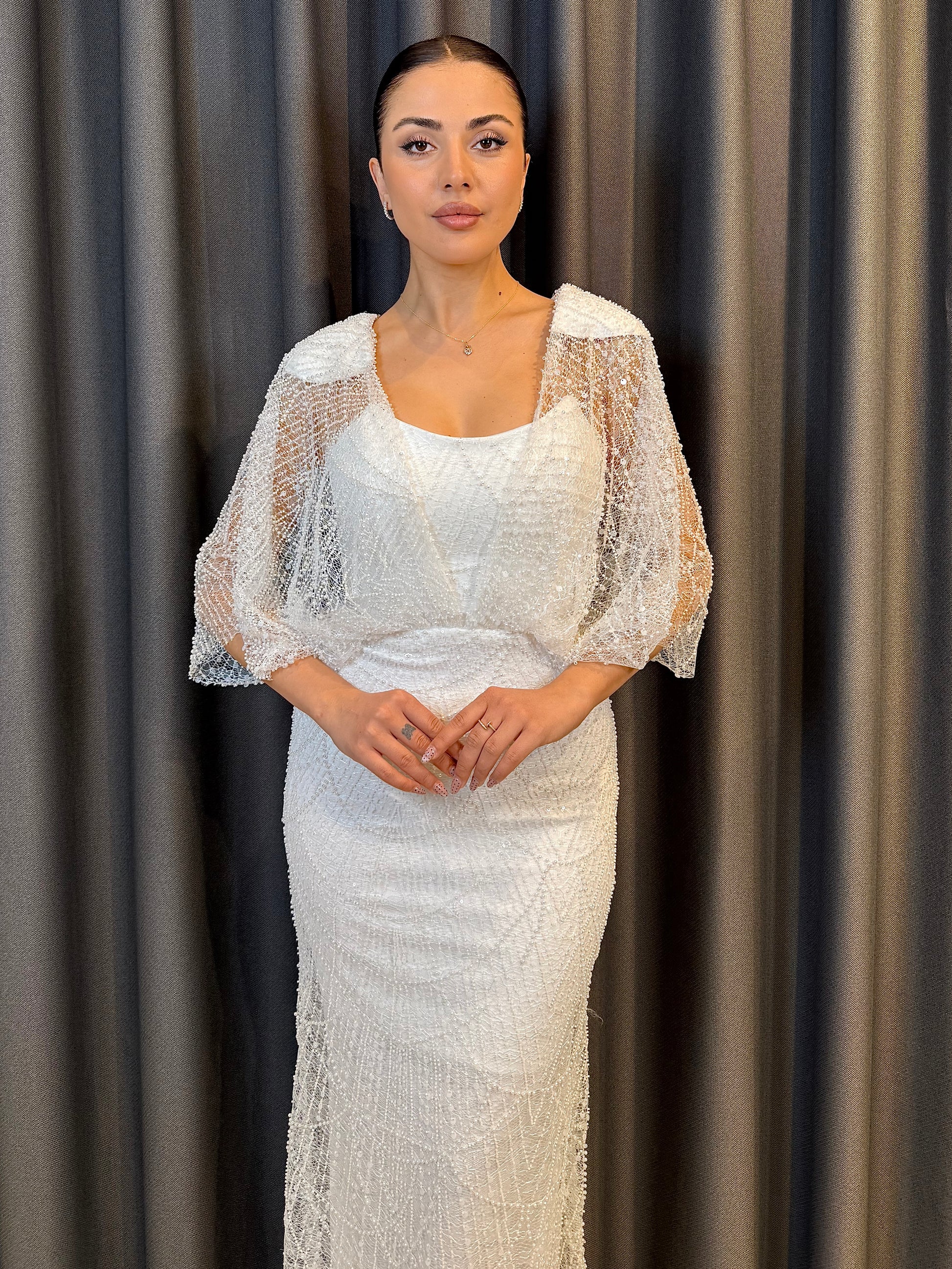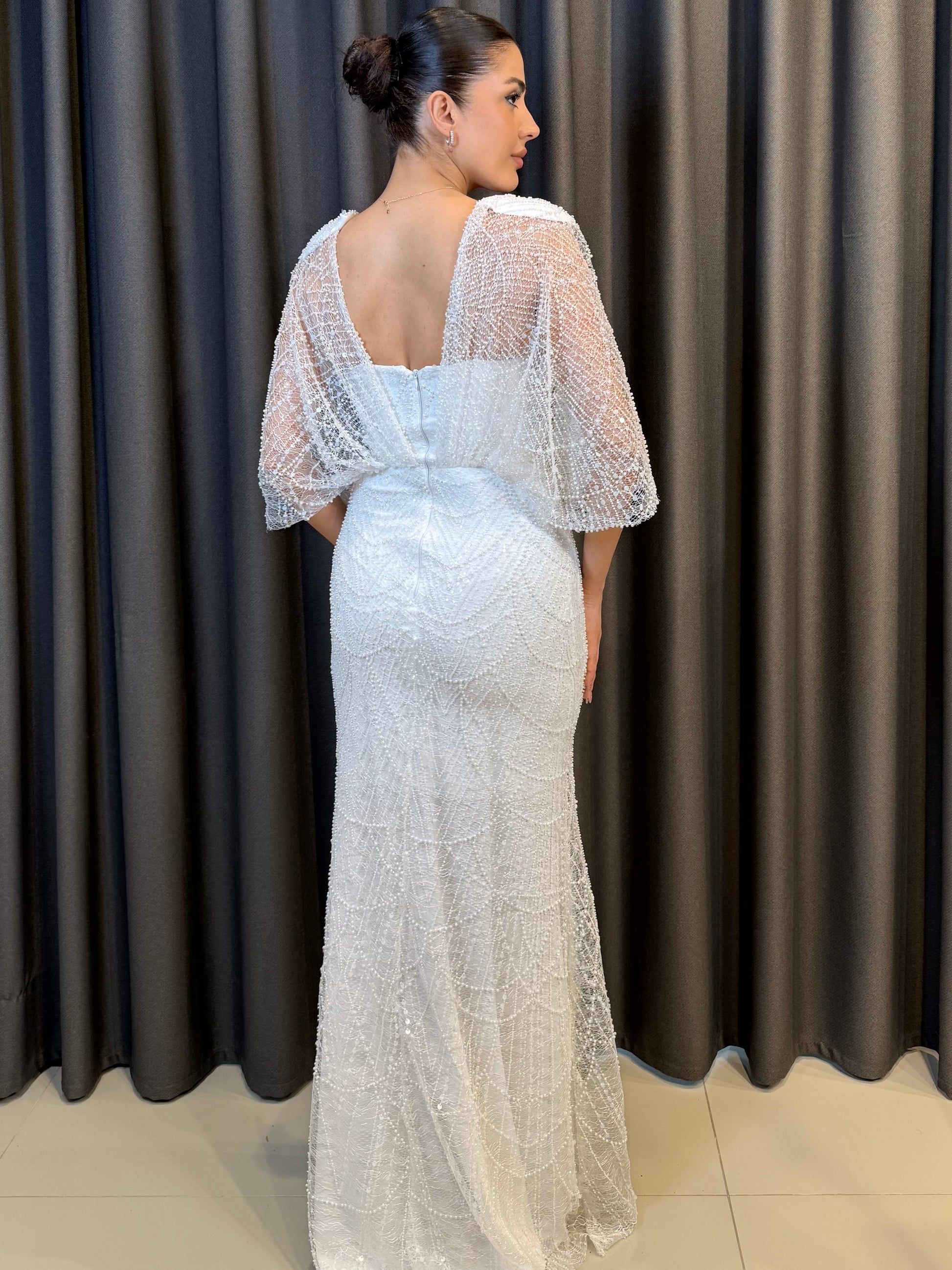 Üst Detay: Omuzlardan dökülen tül pelerin kollar, elbiseye hareketli ve uçuş uçuş bir hava katarak kolların daha zarif görünmesini sağlar.