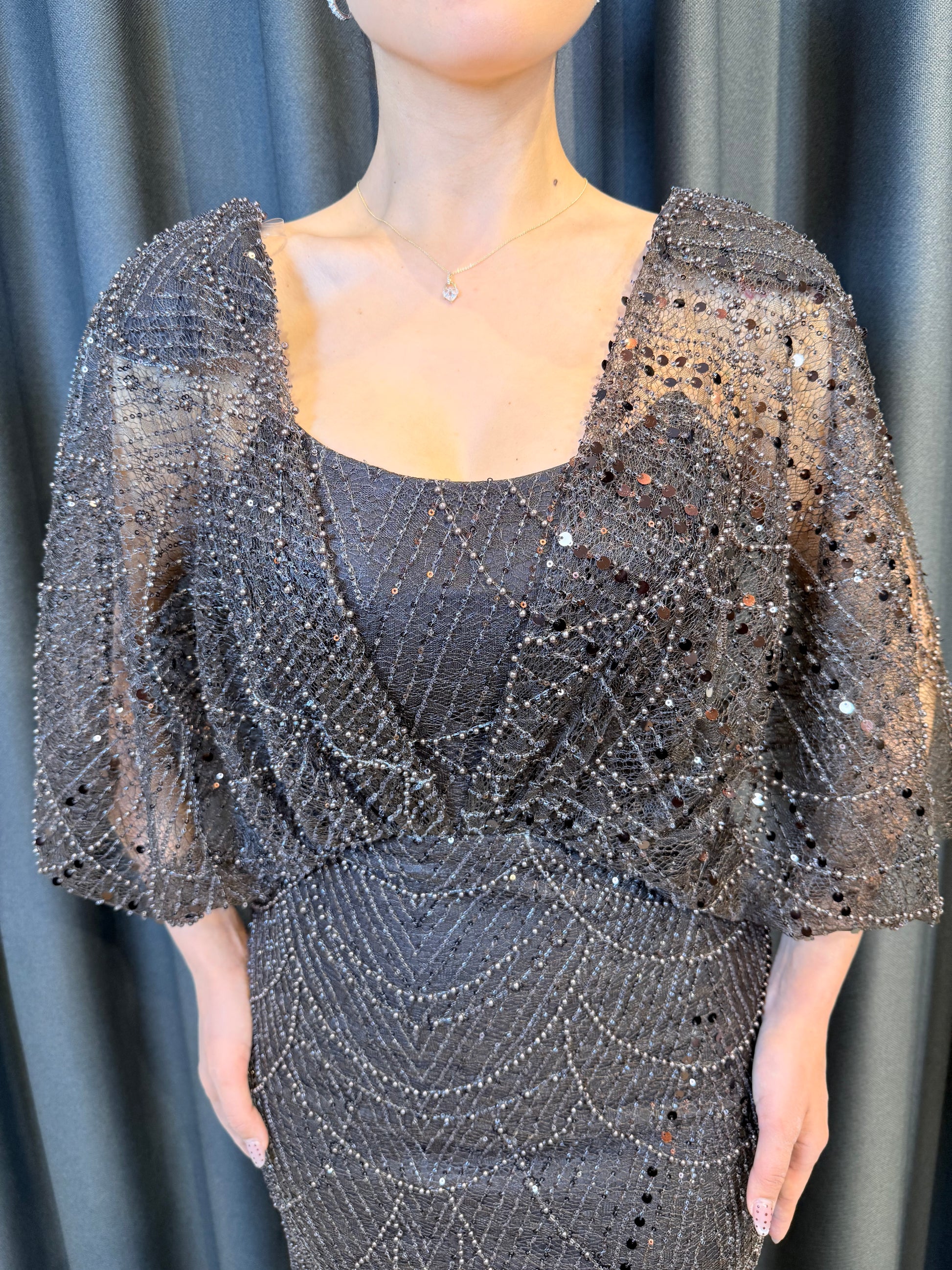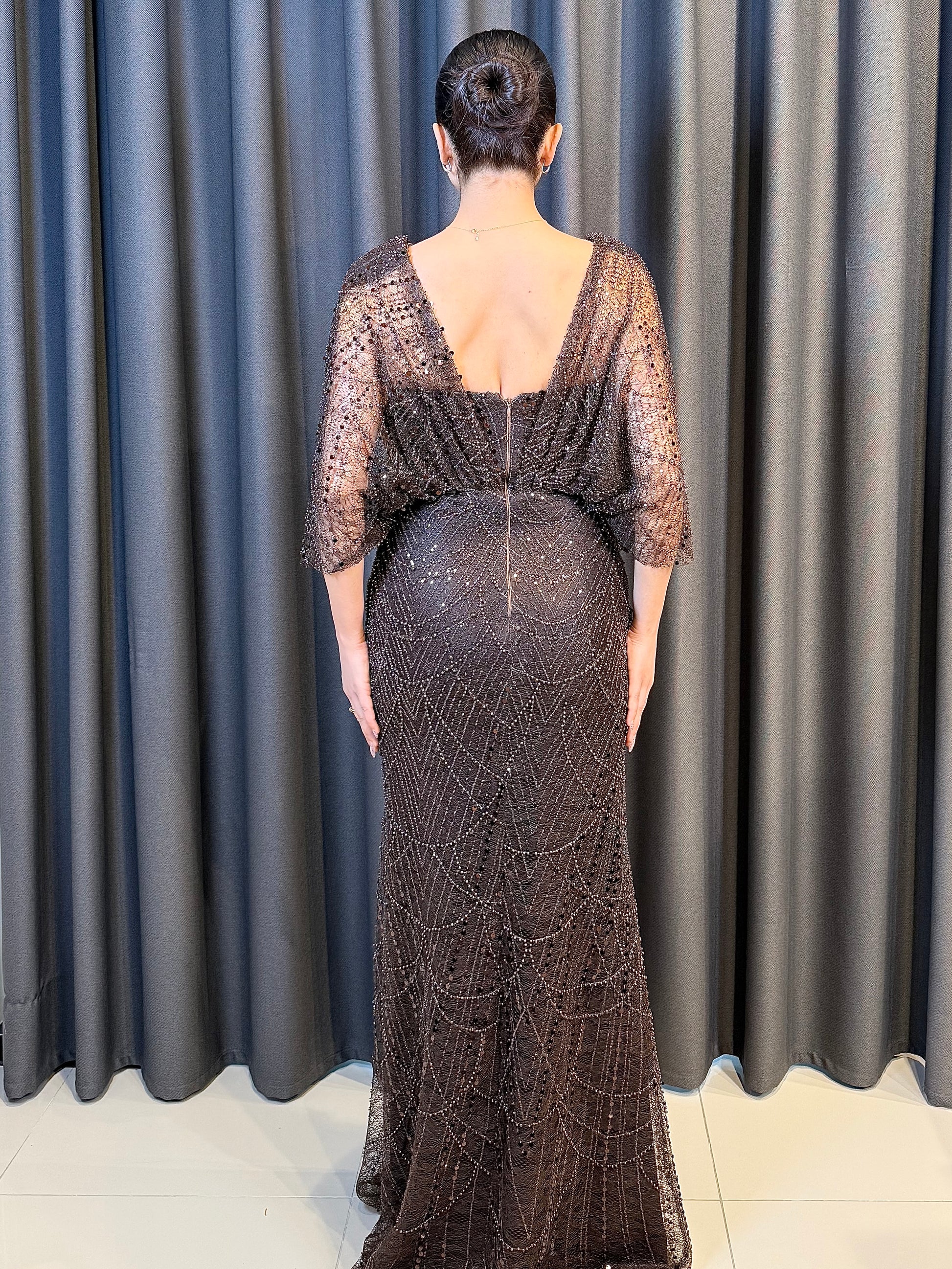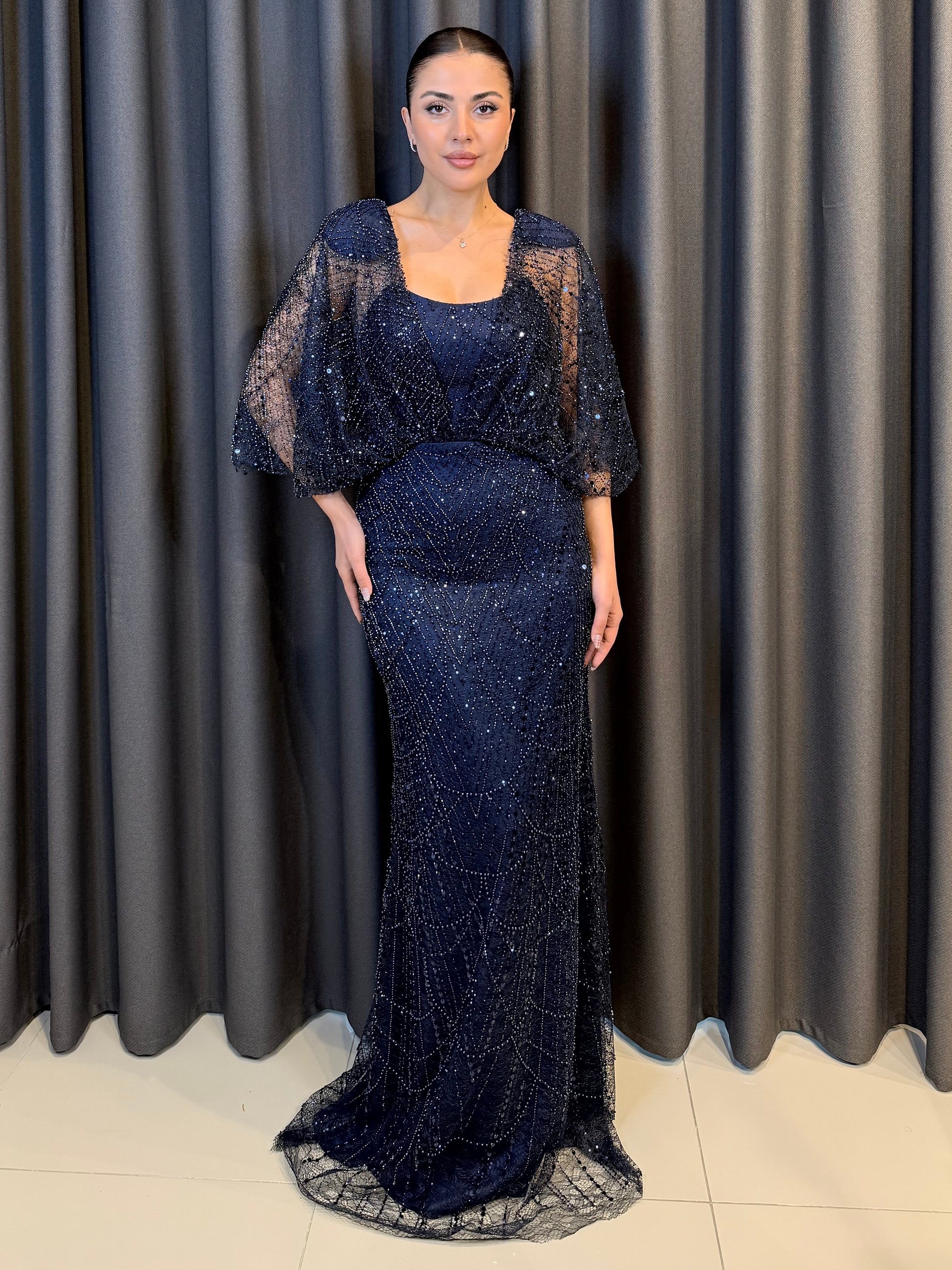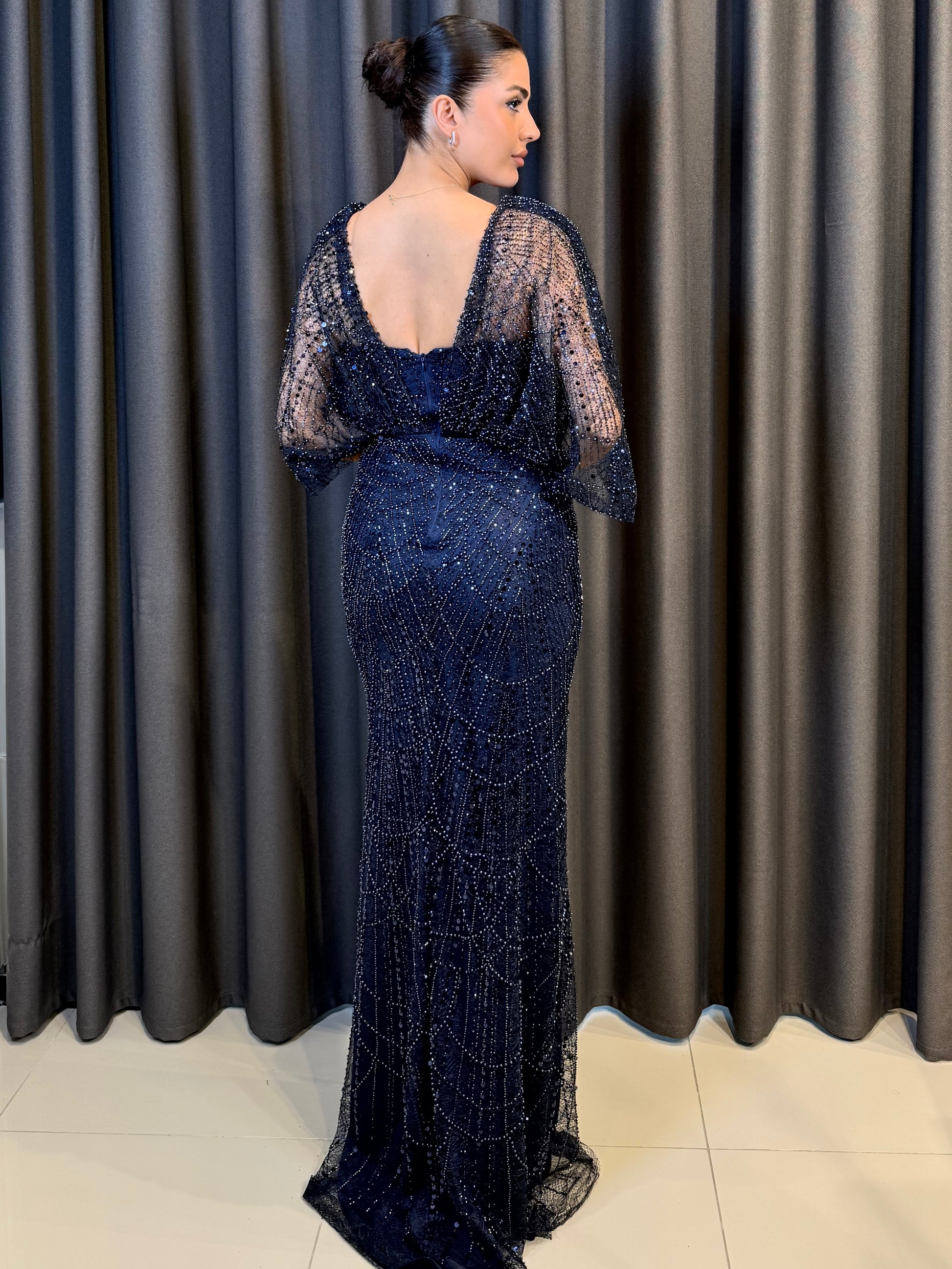 İşleme: Elbisenin tamamı, geometrik desenler oluşturan yüksek kaliteli payet ve kristal boncuk işlemeleriyle donatılmıştır. Bu işlemeler ışık altında göz alıcı bir parlaklık sunar.
