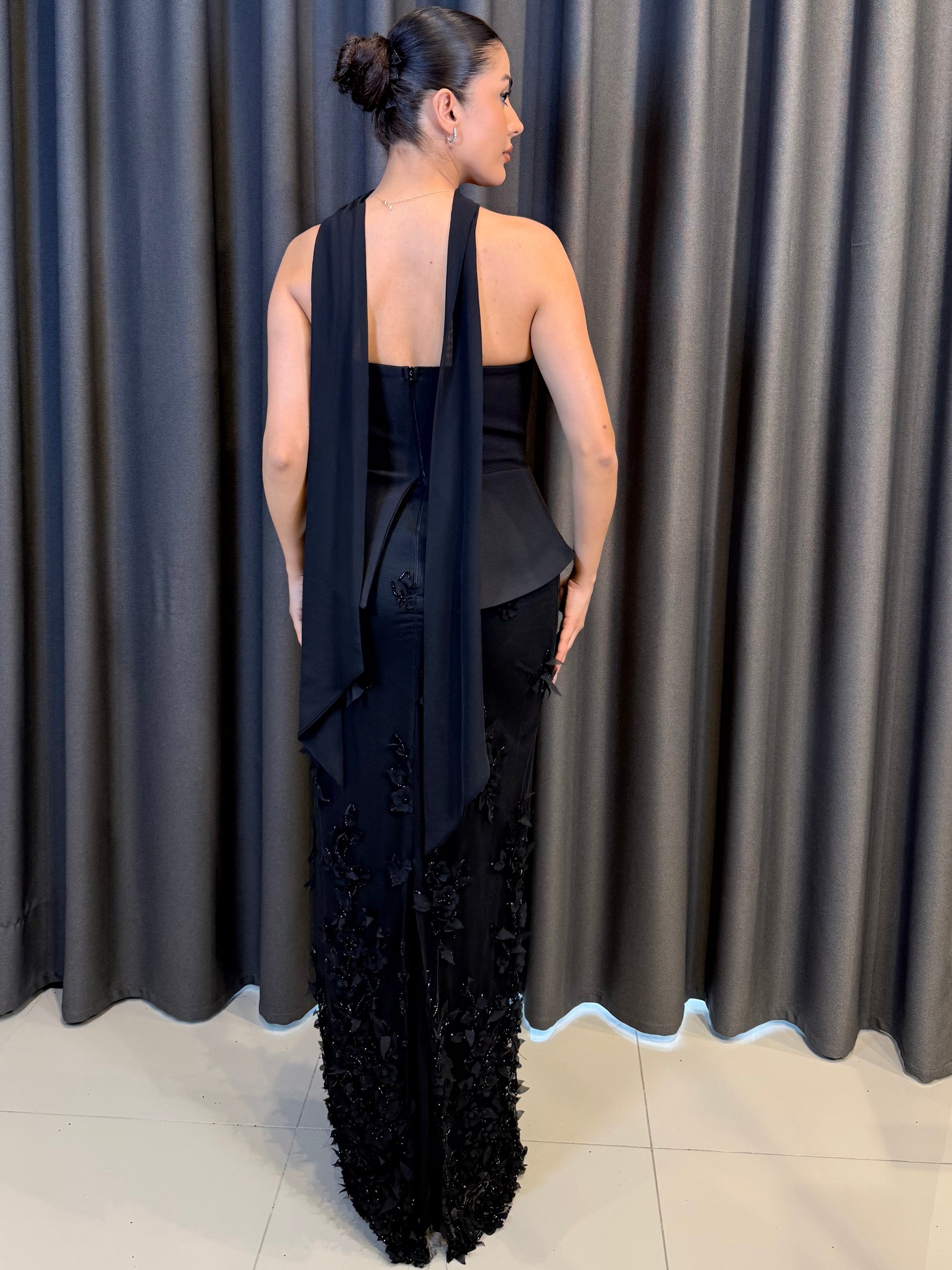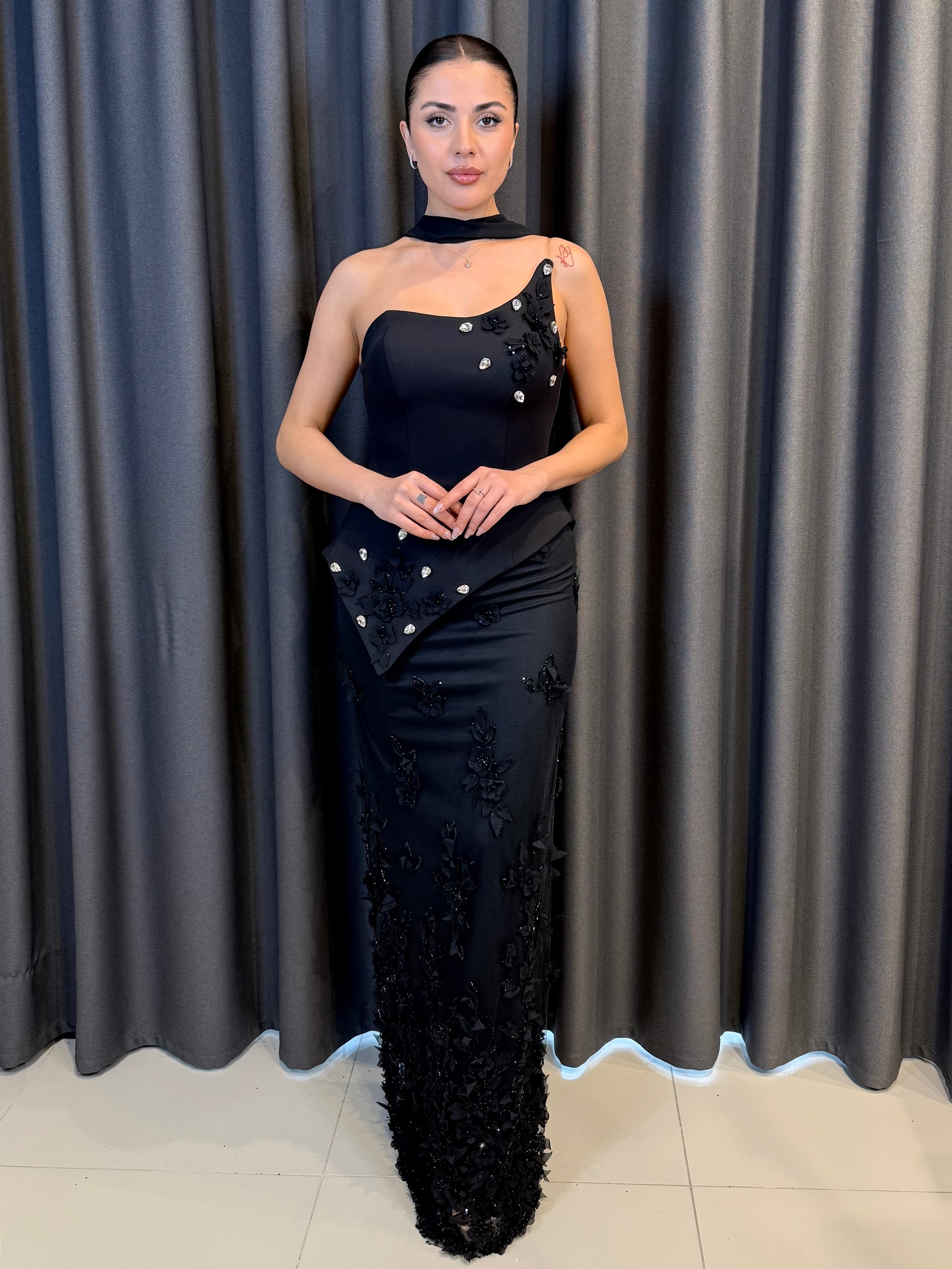 Özel gecelerin, gala yemeklerinin ve seçkin davetlerin en asil ve dikkat çekici tercihi olmaya aday bir tasarım. Bu siyah gece elbisesi, modern kesim hatlarını göz alıcı el işçiliği detaylarıyla birleştirerek size kusursuz bir silüet sunuyor.