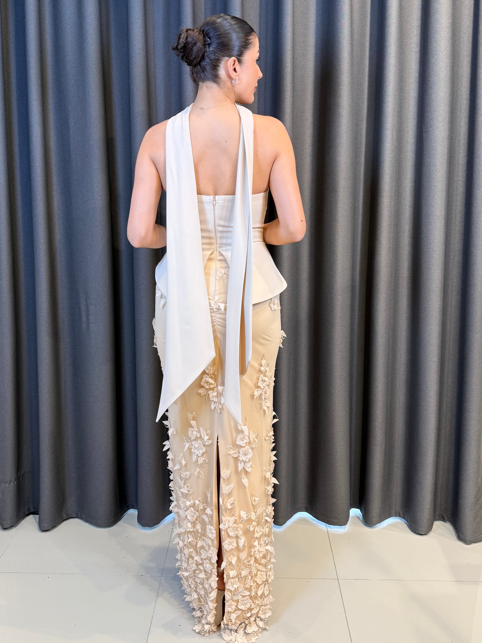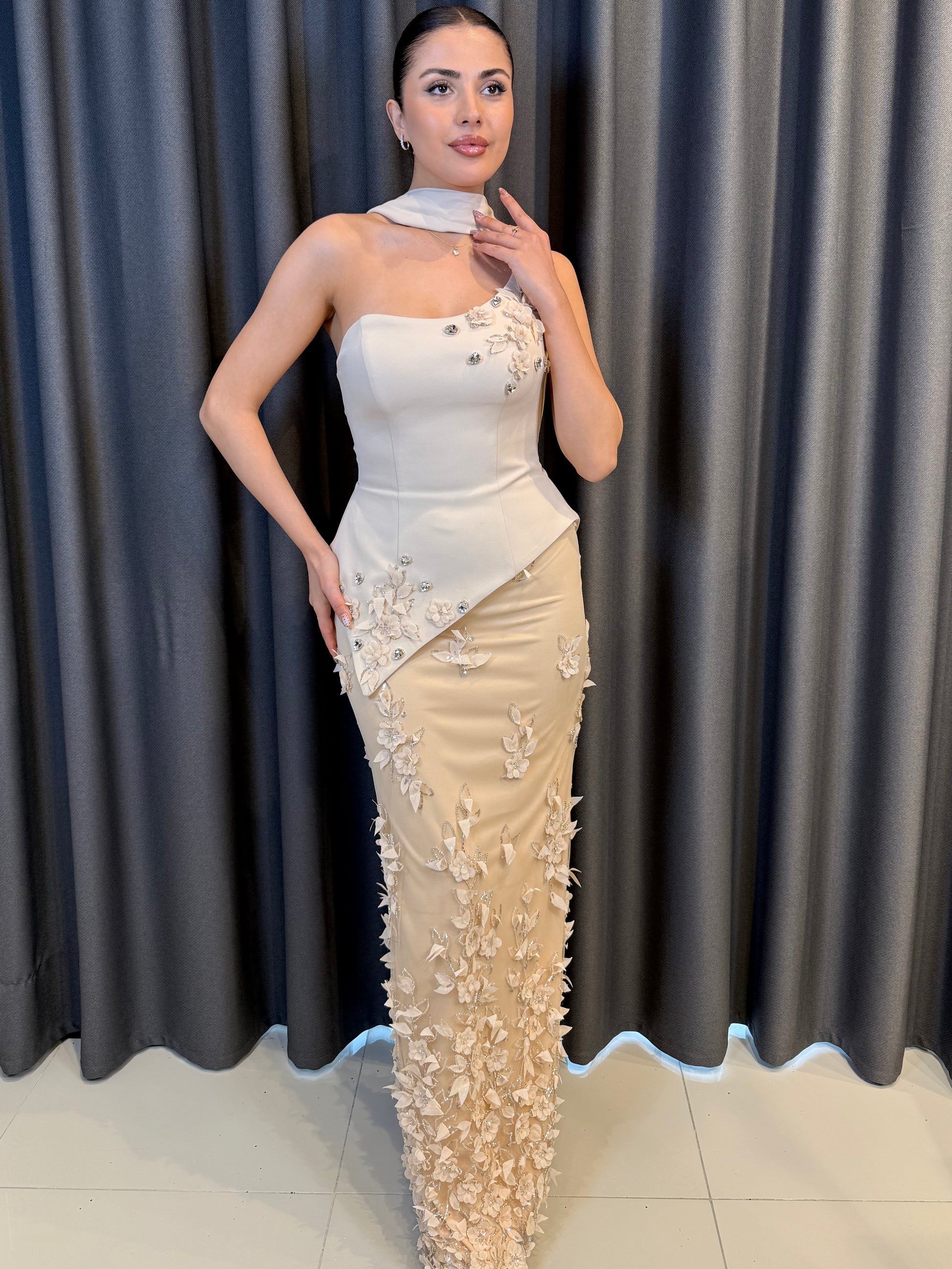 Kusursuz Silüet: Vücudu saran korse formu üst kısım ve dökümlü uzun etek, feminen ve zarif bir duruş sergiler.