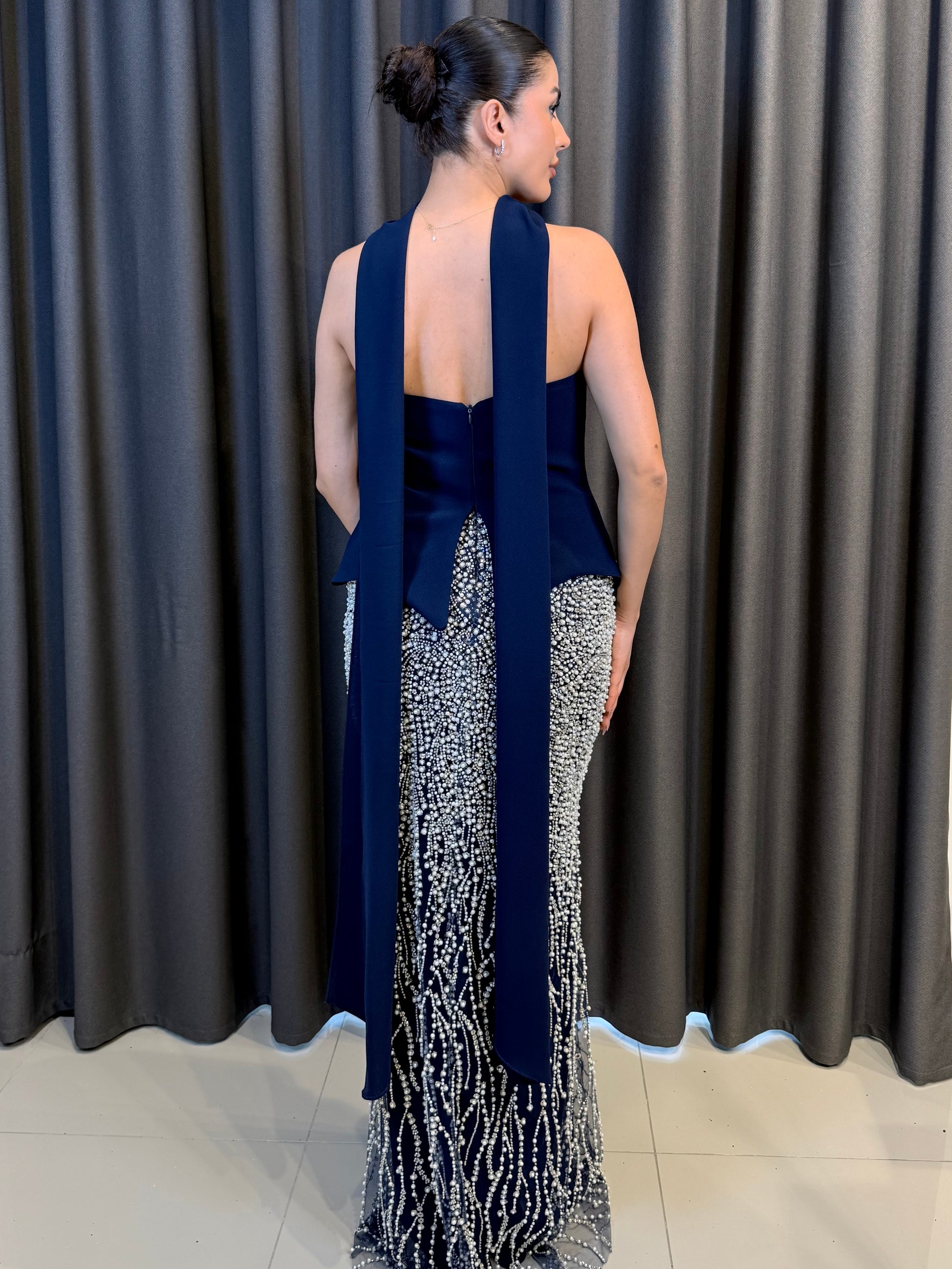 Gecenin en asil rengi laciverti, büyüleyici bir el işçiliğiyle buluşturan bu tasarım, klasik abiye anlayışına modern ve lüks bir yorum getiriyor. İnci ve boncukların kusursuz dizilimiyle hayat bulan bu model, her detayında zengin bir doku sunuyor.