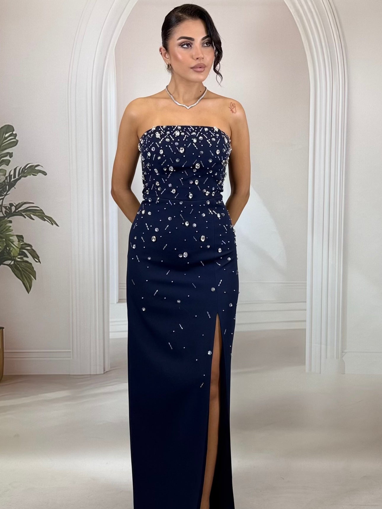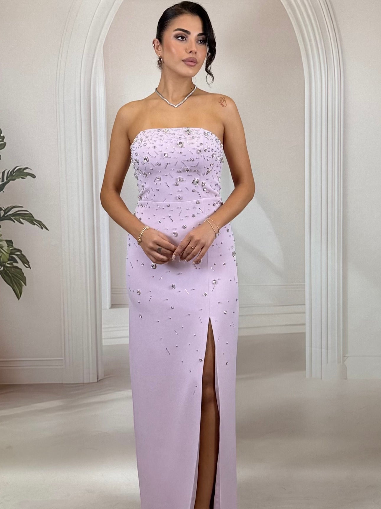 Pudra Straplez Taş İşlemeli Yırtmaçlı Abiye