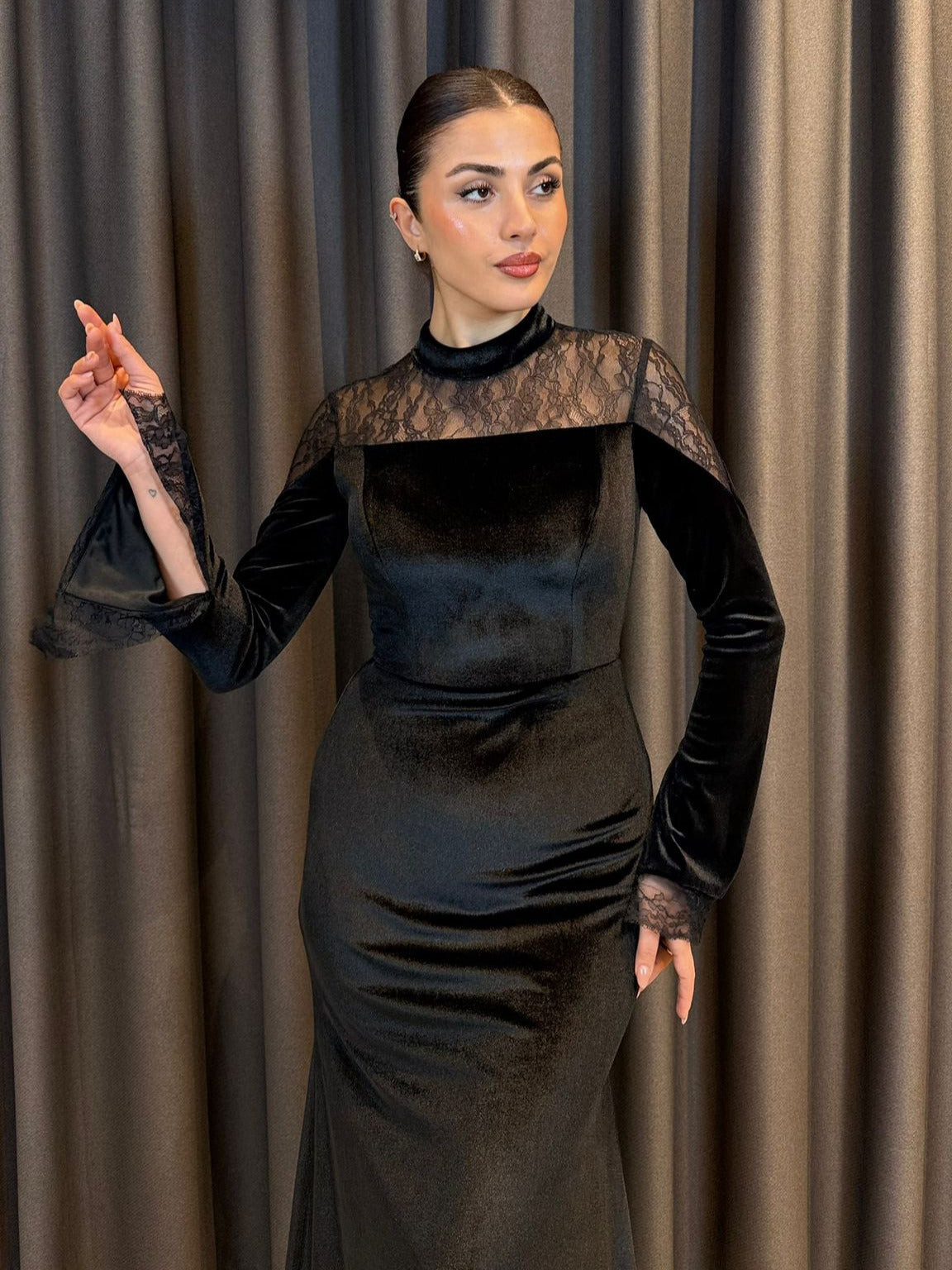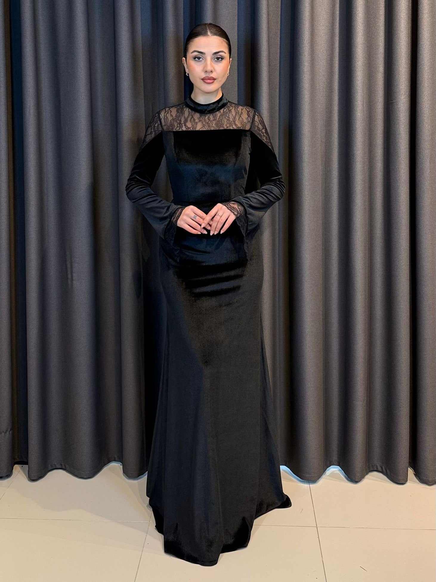 Siyah Kadife Dantel Detaylı Balık Abiye Elbise