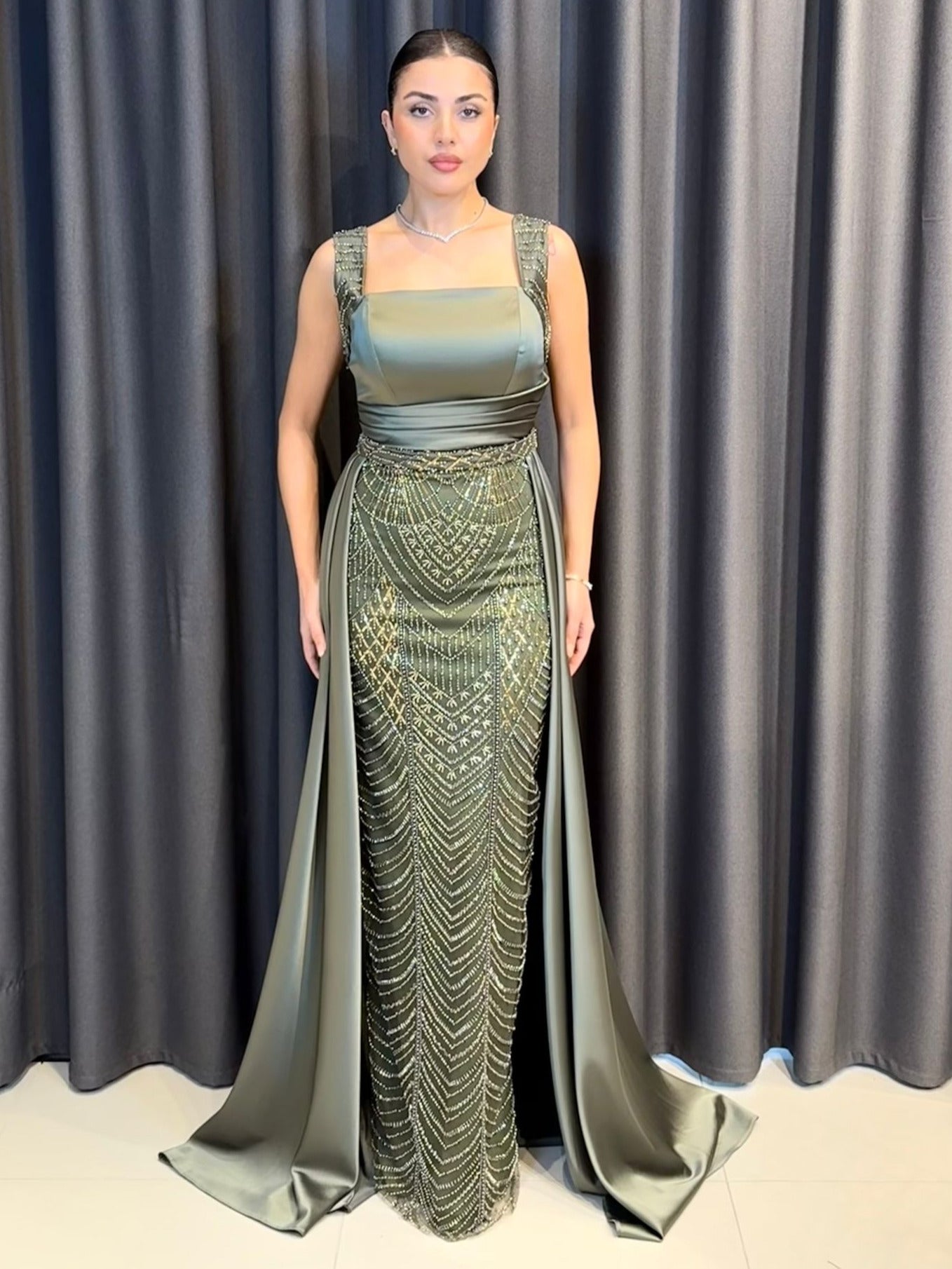 Modern Kare Yaka: Saten göğüs panelini çevreleyen kare yaka kesimi, dekolteyi asaletle vurgularken taşlı askılarla mükemmel bir kontrast oluşturur.