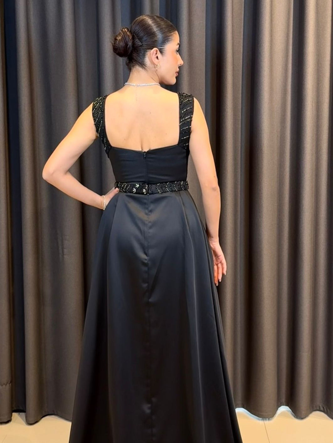 Siyah Saten Taş İşlemeli Kuyruklu Abiye Elbise