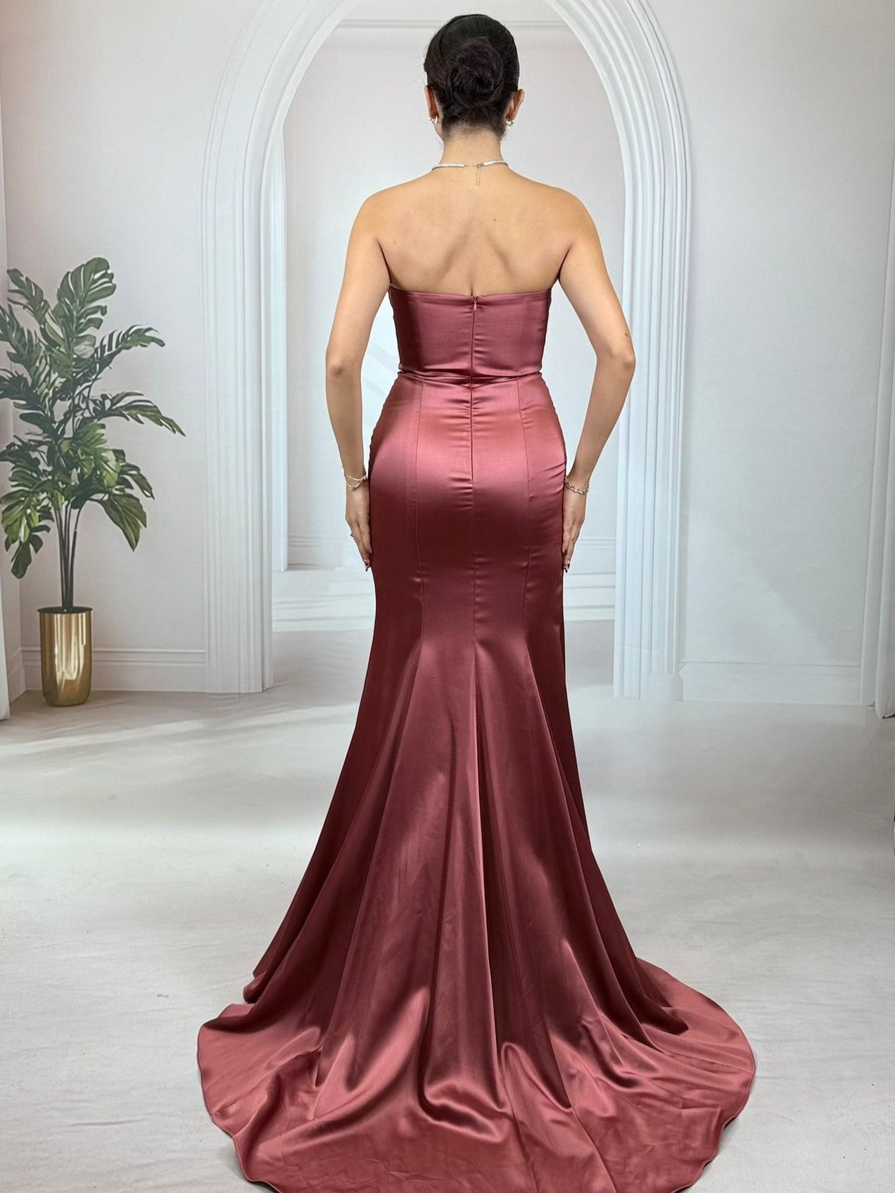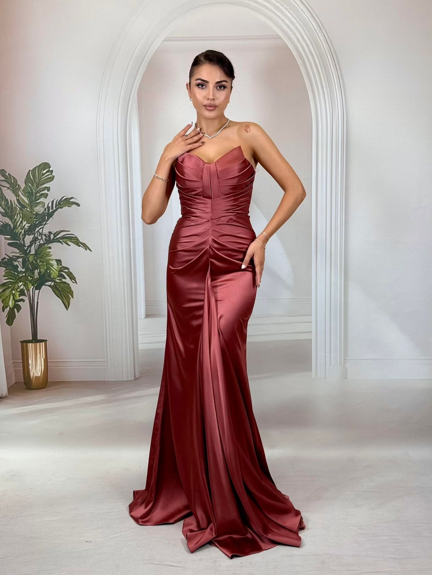 Satenin lüks dokusunu taba renginin iddialı ve zengin duruşuyla buluşturan bu abiye, stil sahibi kadınlar için tasarlandı. Hem klasik hem de modern çizgileri barındıran bu tasarım, özel gecelerinizde fark yaratmanızı sağlayacak.