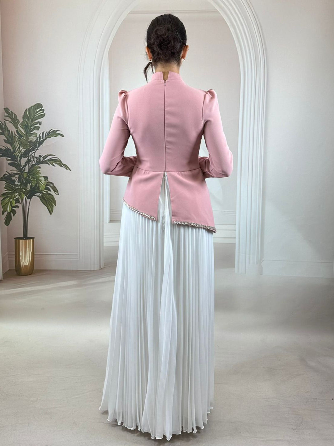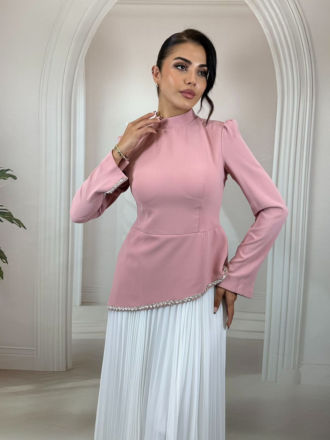 Kristal İşleme Detayları: Etek ucunda ve manşetlerde yer alan ışıltılı taş işlemelerle ekstra bir aksesuar gerektirmeyen şıklık.