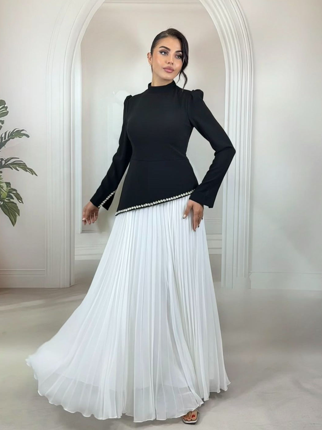 Taş İşlemeli Hakim Yaka ve Piliseli Siyah Byaz Etekli Abiye