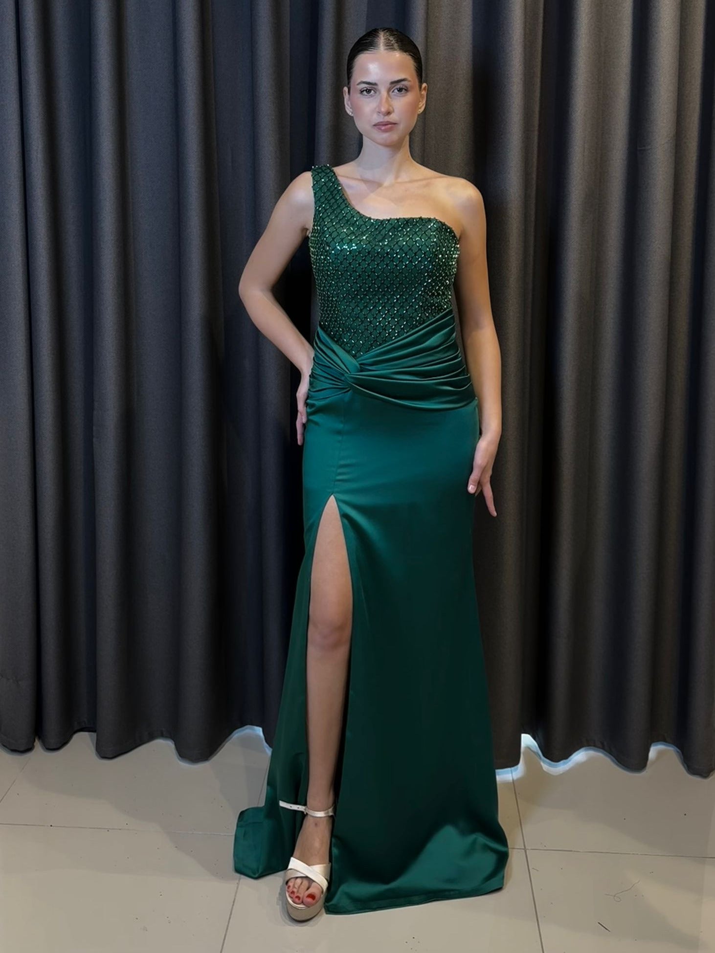 Tek Omuz Payet İşlemeli Zümrüt Yeşili Abiye