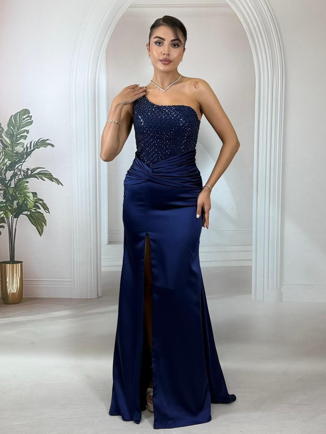 Zarafeti modern tasarım detaylarıyla buluşturan bu abiye, özel davetlerin ve gece organizasyonlarının en çok konuşulan parçası olmaya aday. Derin gece mavisi tonunun asaletini, ışıltılı payetler ve ustaca işlenmiş drapelerle birleştiriyor.