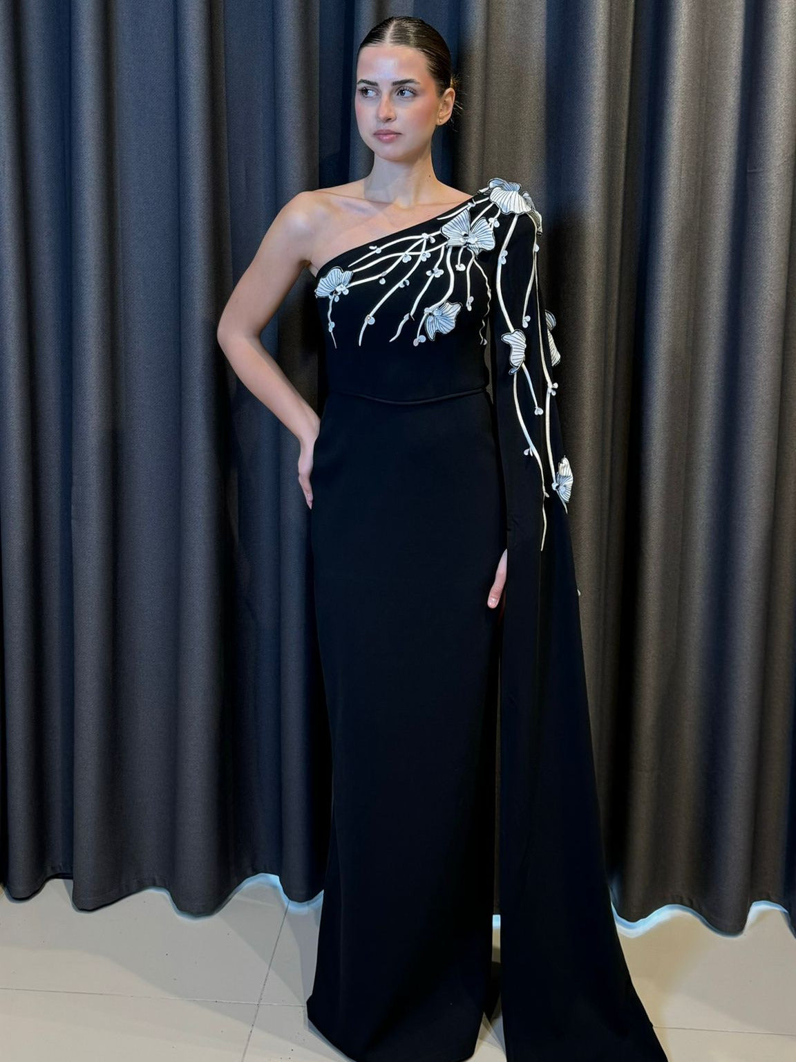 Özel dokulu krep kumaştan hazırlanan bu tasarım, vücudu zarifçe saran yapısı ve dökümlü duruşuyla modern bir silüet sunar. Tek omuz kesimiyle dinamik, omuzdan süzülen peleriniyle ise iddialı bir duruş sergileyen bu parça, el işçiliği floral nakışlarla zenginleştirilmiştir.